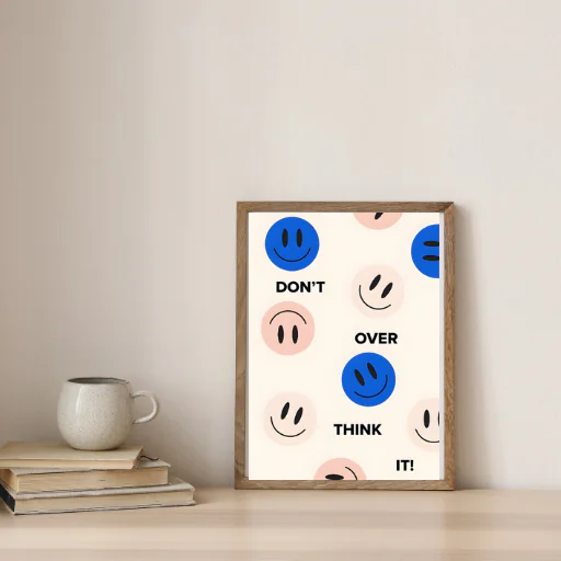 With its clean typography and playful smiley elements, this artwork delivers a simple but powerful reminder to reduce stress, stop overthinking, and take action.