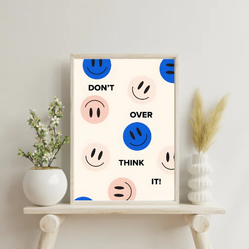 With its clean typography and playful smiley elements, this artwork delivers a simple but powerful reminder to reduce stress, stop overthinking, and take action.