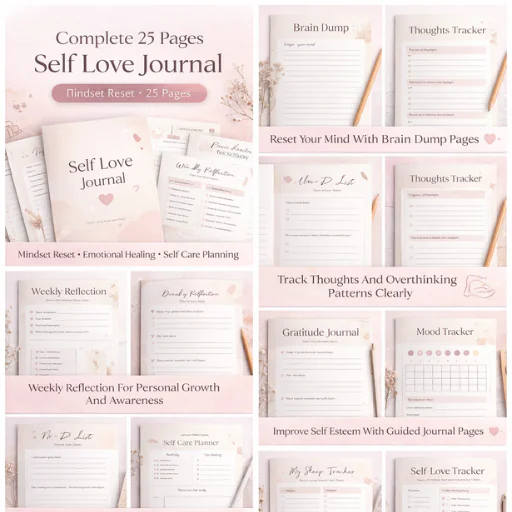 This 25-Page Canva Editable Self-Love Journal is built as a complete mindset reset and emotional growth system, not just a feel-good planner.